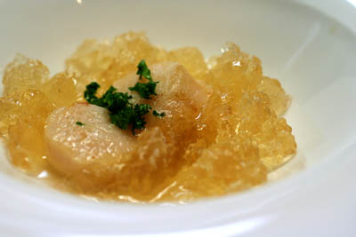 それに、牛乳、生クリーム、鶏ガラスープ、塩を合わせて温めてこれもゼリーで固めたものを崩して添えました。