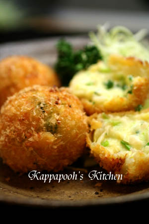 それと330さんはそのまま素麺を衣にされてたのですが、私は鶏だんごを丸めたときにネギが油の中で散りそうな感じだったので、小麦粉、溶き卵をつけてから素麺をつけちゃいました。
