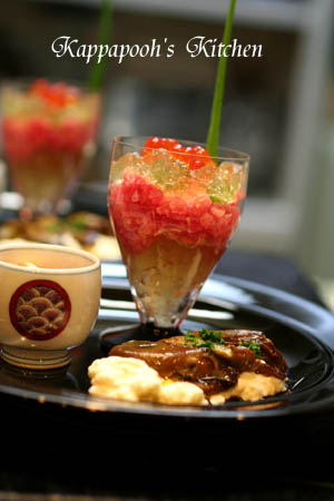 ジュレも330さんはあごだしで作られてましたが、私は簡単スープ用の顆粒ブイヨンで。