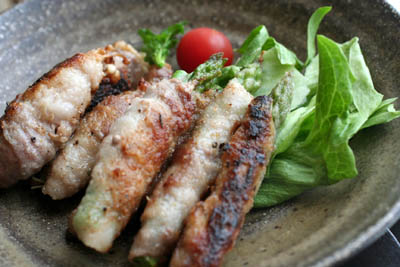 アスパラ、えのきをそれぞれ豚肉で巻いて、クレイジーソルトをふりかけ、