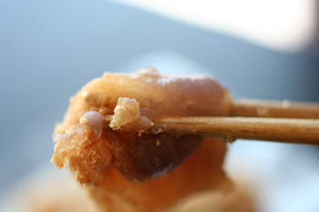 私は、箸で少しづつ重ねて形を作るようにして揚げます。
