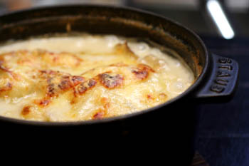 シチューを作るつもりでいたのですが、新玉ねぎを丸ごと入れようと思い、切ったニンジンもジャガイモもこれには入れずに、玉ネギと鶏肉だけでシチューを作って、鍋の上にチーズを乗っけてオーブンで焼き色をつけました。