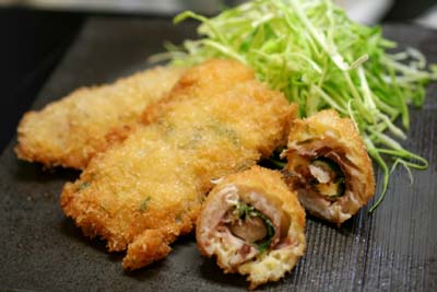 まずは塩・コショウして衣を普通につけて、大根おろし、みょうが、ネギ、大葉をくわえた・・・
