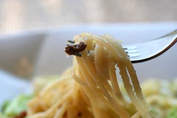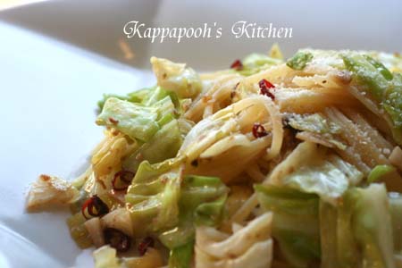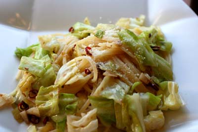 適当な大きさに切ったキャベツを加えてさっと炒めて、ゆで上がったパスタと絡めて、パルメザンチーズを加えて出来上がり。