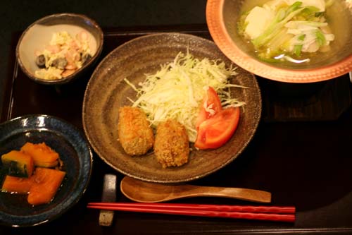 他に・・かぼちゃとひき肉の煮物、キャベツとソーセージのサラダ、鱈と豆腐、白菜の入った一人用鍋。
