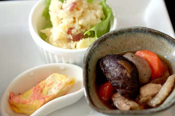 ポテトサラダと、煮物、玉子焼き(明太和え)、これにおにぎりを夫には作りました。