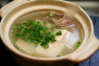 豚ばら肉を1枚入れて・・。豆腐がなめらかになって食べやすいんです。