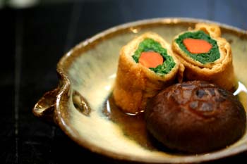 ほうれん草をゆでて、まとめてよく絞り、同じく汁気を絞った油揚げでニンジンを芯にして巻きます。