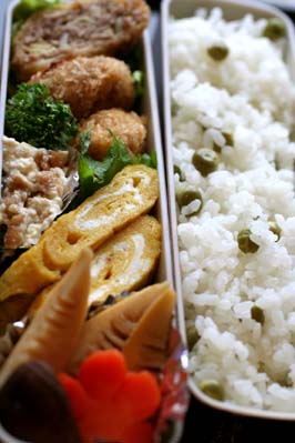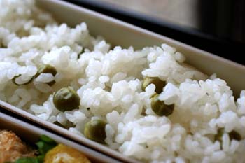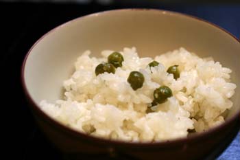 スーパーでグリーンピースが売ってたので、豆ご飯にしました。