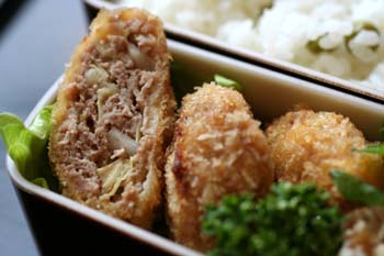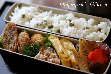 *キャベツと豆腐のミンチカツと豆ご飯弁当*