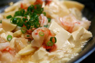 酒、水を加えたら、さいの目に切った豆腐を入れ、鶏ガラスープ、塩で味を調え、水溶き片栗粉でとろみをつけて出来上がり。