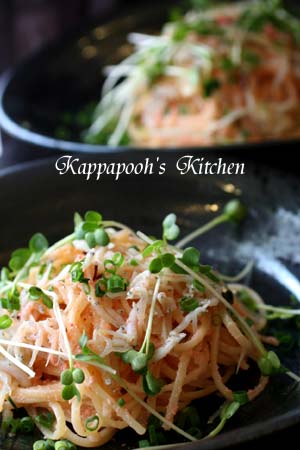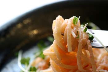 パスタのゆで汁も加えて、ゆであがり時間の1分前にあげたパスタを入れて、明太子、バターを入れ、さっと混ぜ合わせます。