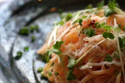 器に盛り付け、ネギとカイワレを散らして出来上がり。